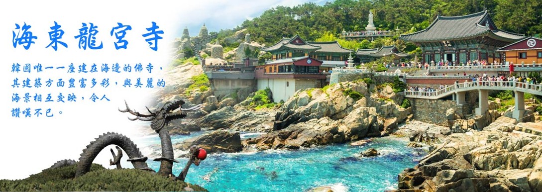 【海東龍宮寺】主奉觀音菩薩,與襄陽洛山寺、南海菩提庵並列韓國三大觀音聖地,最初稱為普門寺,1974年後因住持夢見白衣觀音乘龍升天,便將寺廟名稱更名為《龍宮寺》。此寺廟信徒眾多,人聲鼎沸與浪濤拍打崖邊,激起陣陣的雪白浪花相互輝映,十分壯觀,此時,不妨入境隨俗,在祈願瓦片上寫上自己的願望,保佑心想事成,據說相當靈驗。