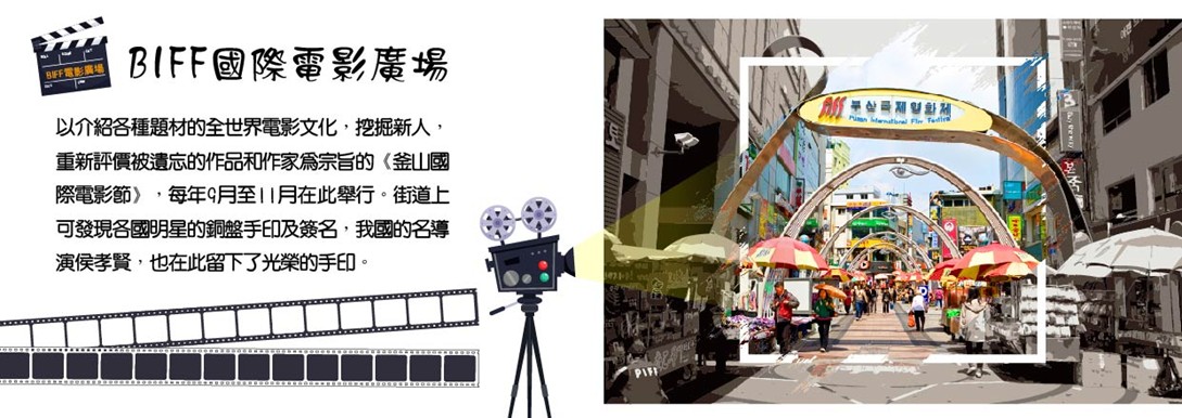 【BIFF國際電影廣場】以介紹各種題材的全世界電影文化,挖掘新人,重新評價被遺忘的作品和作家為宗旨的《釜山國際電影節》,每年9月至11月在此舉行。街道上可發現各國明星的銅盤手印及簽名,我國的名導演侯孝賢,也在此留下了光榮的手印。
