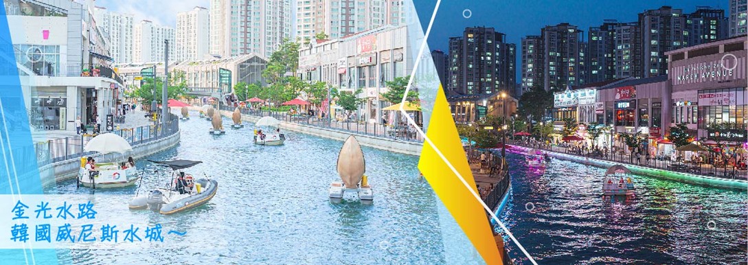 【金光水路】韓國小威尼斯、韓劇『愛麗絲Alice』『九尾狐』拍攝地~一條長達 1.1km的人工河流,兩岸環繞的商場、咖啡廳、餐廳,到晚上時河岸更會打上七彩的燈光,沿岸有各式的噴水設施十分浪漫,更連結著大公園,散步於此還可以呼吸到大自然散發的清新空氣!