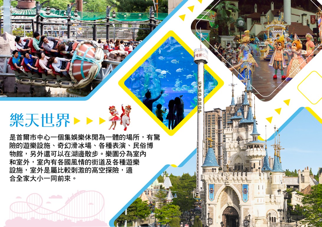 【樂天世界(含門票+自由卷)】是一座集遊樂和文化內涵的超大型城市休閒遊樂園。裡面有世界最大室內主題樂園「驚險樂天世界」、漂浮湖水中的「魔術島」,以及超過30種尖端遊樂設備,供旅客盡情玩樂,五光十色的世界讓人回味無窮。此外還有民俗館、劇場電影院、室內游泳池、滑冰場、保齡球場、會員制體育俱樂部、百貨公司和購物商店等設施。