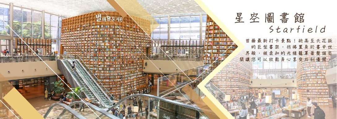【星空圖書館+COEX MALL購物中心】為面積達2,800平方公尺的雙層挑高空間,高達13公尺的書架所透出的暖色照明,讓整體空間變身為輕鬆的書房。圖書館內部準備了多種書桌,為了讓讀者方便使用筆記型電腦也設置了多個插座。尤其是1樓到地下1樓的挑高空間,不僅增加了照明,也特別設計了許多可以自由閱覽的獨立讀書空間。在韓國最大購物商場Starfield Coex Mall內,商場百貨超大,COEX水族館、樂天免稅店、Megabox電影院等,共擁有千禧、中心、亞歐會議、生活、機場五區廣場,超過300家店鋪,吃喝玩樂一應俱全。